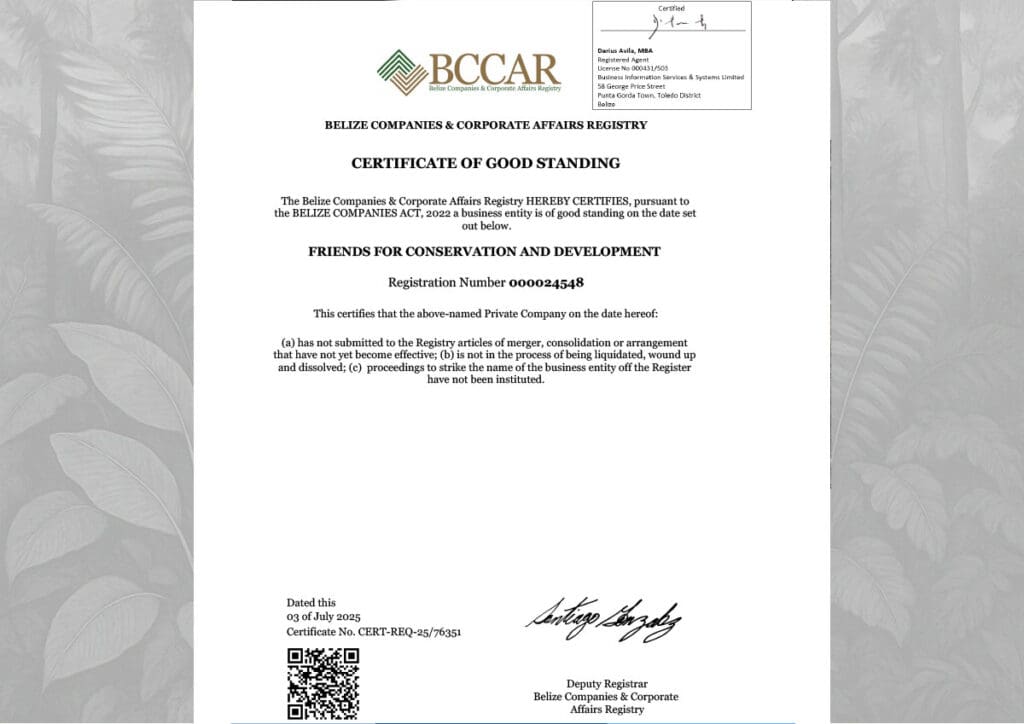 Friends for Conservation and Development (FCD) is pleased to announce that it has received its Certificate of Good Standing from the Belize Companies & Corporate Affairs Registry, confirming the organization’s compliance and active status for the year 2025. The certificate verifies that FCD: Has not filed any articles of merger, consolidation, or arrangement that remain […]