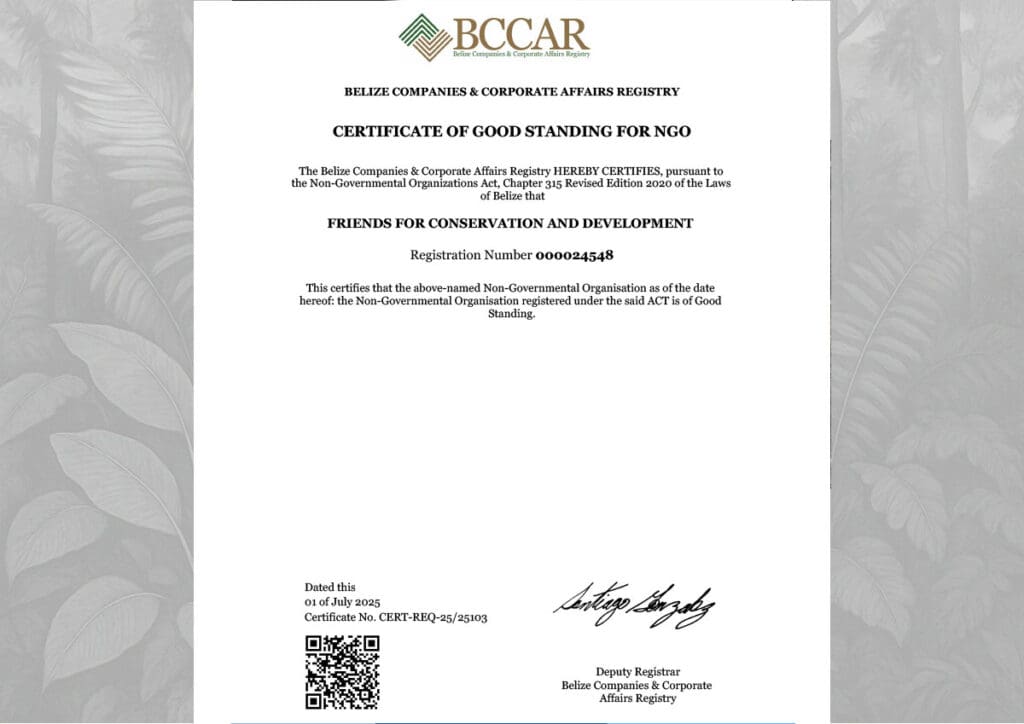 Friends for Conservation and Development (FCD) is proud to announce that it has received its NGO Certificate of Good Standing from the Belize Companies & Corporate Affairs Registry, confirming full compliance with all legal and operational requirements under the Non-Governmental Organizations Act, Chapter 315 (Revised Edition 2020) of the Laws of Belize. This certification reaffirms […]